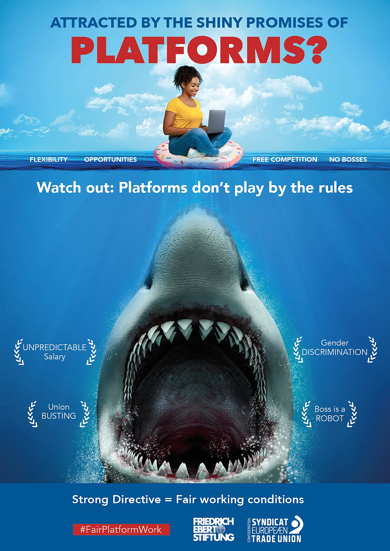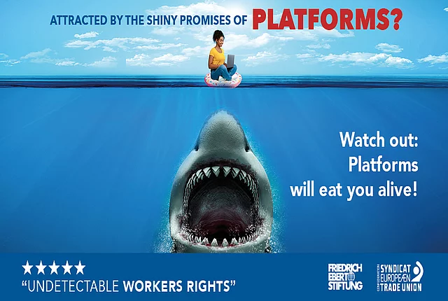 Event Platformisation of Work FES-ETUC Social Media Campaign #FairPlatformWork 18.10.2022 The campaign on improving working conditions in platform work is a joint project between FES Future of Work and ETUC. Wednesday, 08.06.2022 Event Platformisation of Work Online Platforms, Platform Work & Platform Workers in Nordic countries and Germany: What can we learn from each other? This online-event on platform economy in the Nordics and Germany took place on June 8. The recording of the event is now available. Thursday, 30.06.2022 Event Platformisation of Work Intersectional/ Gender Lens Work ahead: labour in the platform economy On June 14, we presented our project “Mapping Platform Economy” and discussed in Brussels with experts the future of labour in the platform economy. Thursday, 13.10.2022 Event Platformisation of Work Online Platforms, Platform Work and Platform Workers in Portugal, Romania, Spain and Germany: What can we learn from each other? This online event on platform economy in Portugal, Romania, Spain and Germany took place on October 13. The recording of the event is now available in English, German, Portuguese, Romanian & Spanish. Join our campaign! Please find all posts of our campaign on Twitter here. FES Future of Work and ETUC have launched a joint Social Media Campaign on the adoption of the Directive to improve the working conditions of people working through digital labour platforms. As both ETUC and FES share the same values and objective for fair working conditions for platform workers, we would like to stress the importance of strengthening our cooperation in achieving the common goals. We strongly emphasise the importance of the following amendments: Until proven otherwise every platform should be considered as an employer. Regardless of their flexible working arrangements, platform workers must enjoy all labour rights. All workers and their representatives must be able to understand how the algorithmic management works. The forward-looking definition of a labour platform should not give any chance for misinterpretation, and must apply to all existing and future labour platforms in all sectors. We kindly invite you to LIKE, SHARE & COMMENT on our upcoming posts of @FES_FoW and @etuc_ces. Image: Creator: © JQ&ROS Visual Further information #FairPlatformWork (ETUC website) FES-Project 'Mapping Platform Economy' FES factsheets on Online Platforms and Platform Work in different Europeans countries FES policy Report: Online Platforms and Platform Work